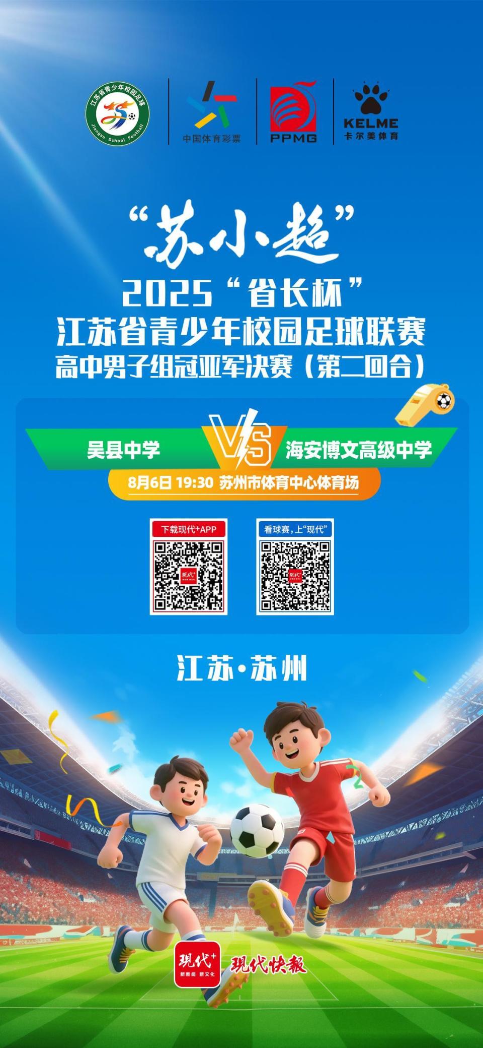 江苏省校园足球顶级赛事——2025“省长杯”江苏省青少年校园足球联赛高中男子组冠亚军决赛,将在苏州市体育中心开赛,对阵双方是苏州吴县中学队和海安博文高级中学队。